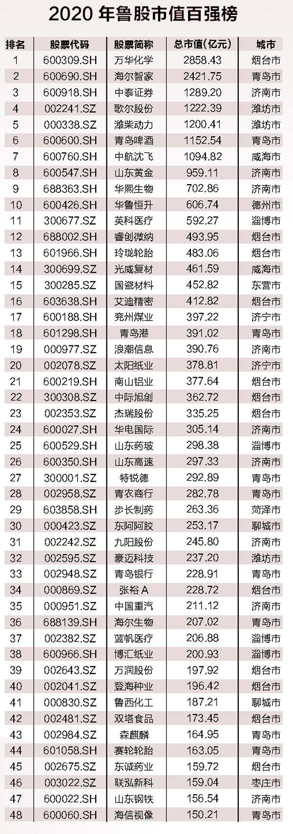 在2021鲁股市值百富榜上,共有7家企业跻身千亿俱乐部,分别是万华化学、海尔智家、中泰证券、歌尔股份、潍柴动力、青岛啤酒、中航沈飞。
