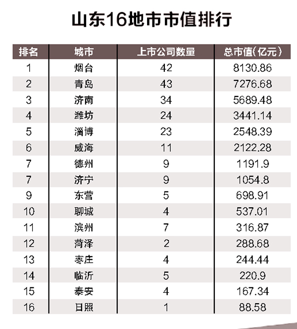 分地域来看,山东16个地级市中,目前青岛市上市企业数量最多,为43家,烟台市紧随其后,以1家之差居第二,省城济南位列第三,总共有34家企业上市,基本延续了前几年上市企业版图分布。
