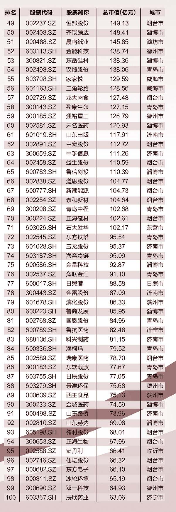 以市值来看,其排序与企业数量排序并不重合。烟台虽比青岛少一家企业,但却以8130.86亿元的市值夺魁,青岛则以7276.68亿元的市值区居第二。细分来看,虽然青岛拥有2家市值过千亿的企业,烟台只有1家,但因为鲁股龙头万华化学在烟台,且拥有较多百亿以上的企业,所以烟台成为鲁股市值聚集地。