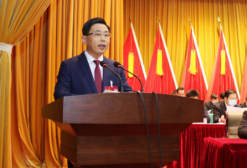 济南平阴县委副书记、县长王秀成在作《政府工作报告》 平阴县融媒体中心供图
