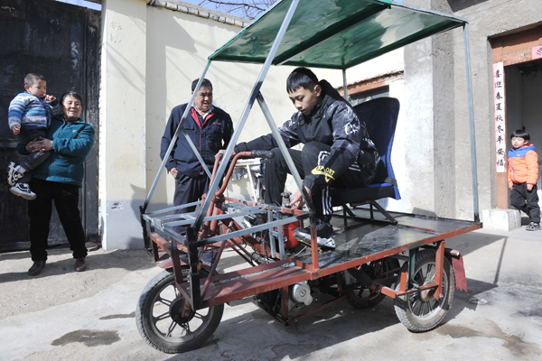 放寒假后,15岁的济南少年亓祥硕每天都会骑着自制的四轮山地汽油摩托车,载着弟弟妹妹在村里转上几圈,村里人看到后,都忍不住连声称赞:“小家伙真厉害,摩托车都能捣鼓成了。”亓祥硕心想:“这算啥,我还想自己造飞机呢。”不是异想天开,他已经画了一本制造飞机的图纸,各种零部件也在筹备收集中,等时机成熟,亓祥硕就想大干一场,自制一架小型直升机,圆了自己的“飞天梦”。 ◎文/山东商报·速豹新闻网记者 张雯雯 图/记者 王晓峰
