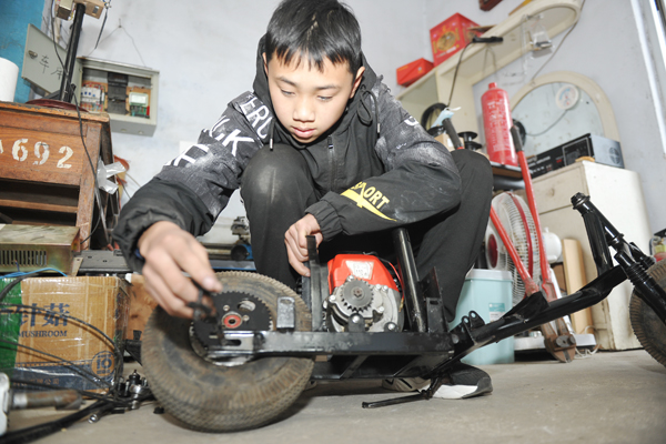 在姥爷的支持下,亓祥硕的“拆家”本领一发不可收拾。像他这个年纪的孩子,很多都沉迷于手机和网络游戏,但亓祥硕对那些不感兴趣,他最喜欢去的地方是废品收购站。在那里,他享受着“淘宝”的快乐,别人眼中的破烂儿都是他的“宝贝”,他用自己的零用钱把一些废旧物品买回家,然后经过各种拆装修理,变成自己的发明创造。“我们家庭条件也不富裕,亓祥硕都是去废品站论斤称买那些零件,也花不了多少钱,买的最贵的就是一个小汽油机和一台小车床,几百块钱。”吴增希说。