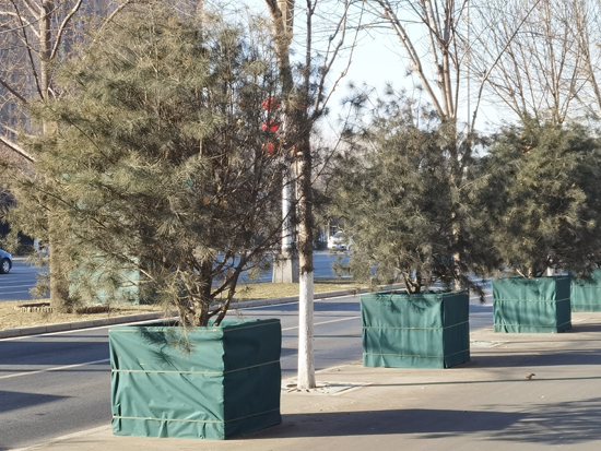一般来说,对于耐寒性差的苗木和边缘树种需要采取树干涂白、喷施防冻剂、防寒布裹干等不同防寒措施。对于常绿针叶树、珍贵树种和新引进阔叶树,除采取以上措施外,在树木的上风方向架设风障。