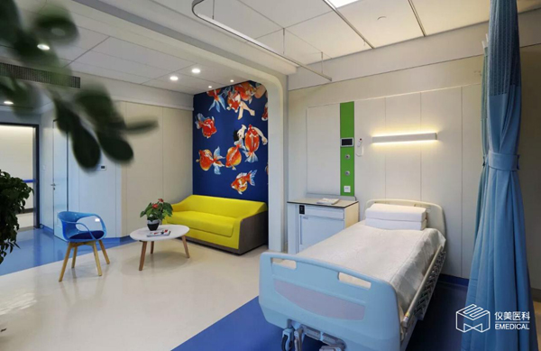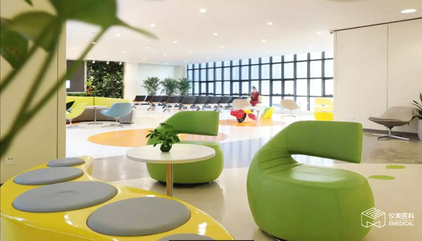 而对于儿童来说,丰富的色彩、活泼有趣的图案是最具有吸引力的,能够转移其注意力,消解孩子对医院的抗拒心理。在儿科诊室中,仪美医科(证券代码:839643)选择以贴近大自然、明朗活泼的颜色为空间主色调,装饰画以童趣涂鸦的形式来呈现,辅以同色系、线条极简的医用家具,让孩童倍感温馨适从,不知不觉中逐渐适应医院这一陌生的新环境。