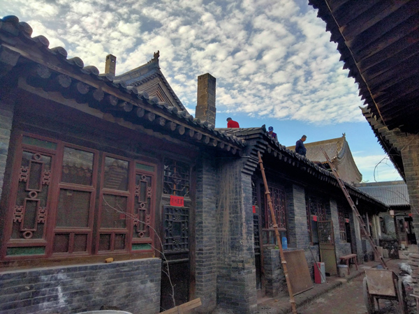 此时的厢房,工人正在屋顶修缮松动的瓦片。耿保国说,一连几日,平遥的雨未停,这座四百年的房屋,早已渗进许多雨水。