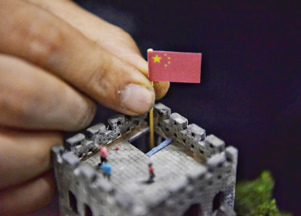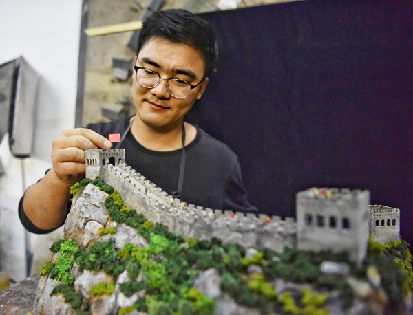 “最近订单有些多,时间紧、工作重,好在是赶在国庆节前把作品完成了。”李寿升边笑着,边用小毛刷扫了扫微缩长城上沾染的树粉。