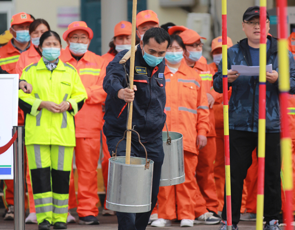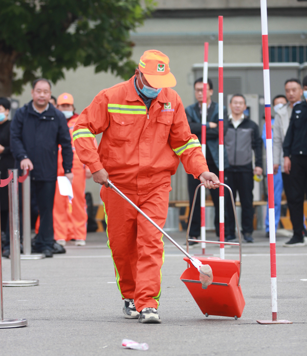 随着裁判的一声哨响,只见比赛选手在“赛道”上熟练地完成捡拾散落的垃圾、清洁垃圾桶、更换垃圾桶内的垃圾袋、跑回赛道终点等,围观的环卫工人不时加油呐喊……