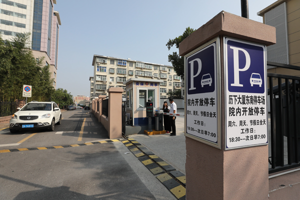10月1日上午9点30分,记者驱车来到位于解放东路的济南市历下区人民政府。门口工作人员告诉记者,面向社会车辆开放的停车场是位于单位东侧50米处的历下大厦东南停车场。顺着工作人员的引导,记者在东南停车场入口处看到,墙体外侧有块白底蓝标的“停车场对外开放公示牌”,牌上醒目位置标注着“院内开放停车”字样。