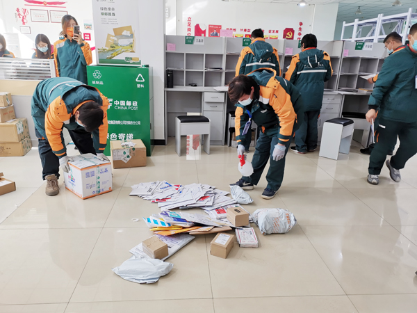 11月11日13时,一辆邮件转运车开到济南邮政历下分公司高新揽投部门前,这是当天第二频次转运车。如果快件不算多,每天会有三频次转运车从邮件处理中心开到各个揽投点,高峰时则会增加频次。“都准备好,车来了!”随着一声令下,快递员们戴着口罩、手套,打开车厢门,手持喷雾器将84消毒液喷洒到包裹的表面,然后再依次卸到室内。大约十几分钟后,满满一车数百件包裹被全部卸完并逐一消杀完毕。揽投员紧接着仔细观察着快递单面,手上麻利地将不同区域的快递进行分拣、装车,很快,大厅内堆积的“小山”就被分拣完毕。“一些装有信件的包裹,拆出来后还要逐件消杀,不留死角。”王鑫源说,他在将分好的快递装车之前,还要用酒精对快递三轮车车厢仔细消毒,快递包裹也会再次消毒。这样,快递包裹经过三级消杀之后才进行派送。