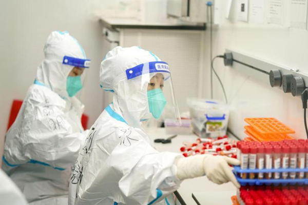 工作人员在“火眼”移动方舱实验室检测核酸标本 图据央视新闻