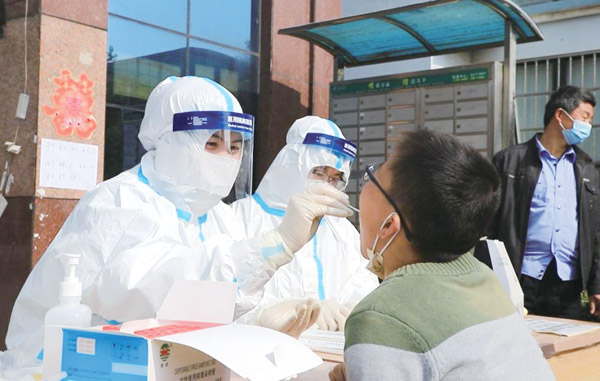 在日照五莲一社区核酸检测点,居民正在接受采样