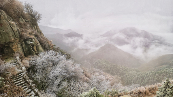 昨日,泰山今冬首雪如期而至。整个岱顶,变成了一座冰雕玉砌的童话城堡。