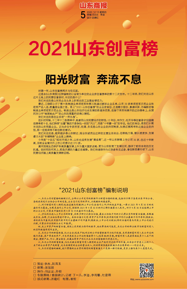 最近,工信部公示了第六批制造业单项冠军和第三批通过复核企业名单,山东39家单项冠军示范企业和冠军产品入选,数量居全国之首。登上“2021山东创富榜”的企业家背后,正是歌尔股份、景津环保、齐峰新材等制造业单项冠军示范企业。制造业是山东经济社会发展的根基和优势,在接下来即将展开的这份榜单上,全国网友口中“啥都能生产”的山东的厚重积淀得以展现。