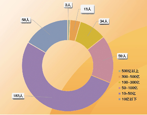 此外,财富在50亿元-100亿元之间的企业家有59位,在10亿元-50亿元之间的有183位,低于10亿元的有58人。从区间分布可以看出,绝大多数企业家的财富,都集中在10亿元-50亿元之间。