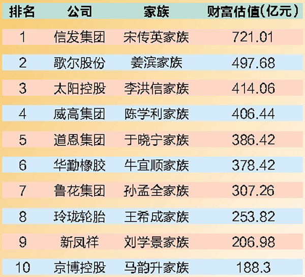 此外,跻身前十大家族的还有威高集团的陈学利家族、道恩集团的于晓宁家族、华勤橡胶的牛宜顺家族、鲁花集团的孙孟全家族、玲珑轮胎的王希成家族、新凤祥的刘学景家族以及京博控股的马韵升家族。十大家族合计创富3760.39亿元,占到上榜企业家创富总额的17.65%。