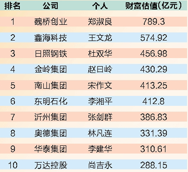 十大创富个人则有魏桥创业的郑淑良、鑫海科技的王文龙、日照钢铁的杜双华、金岭集团的赵曰岭、南山集团的宋作文、东明石化的李湘平、沂州集团的张剑群、奥德集团的林凡连、华泰集团的李建华、万达控股的尚吉永,他们总共创富4394.52亿元,占到上榜企业家创富总额的20.63%。