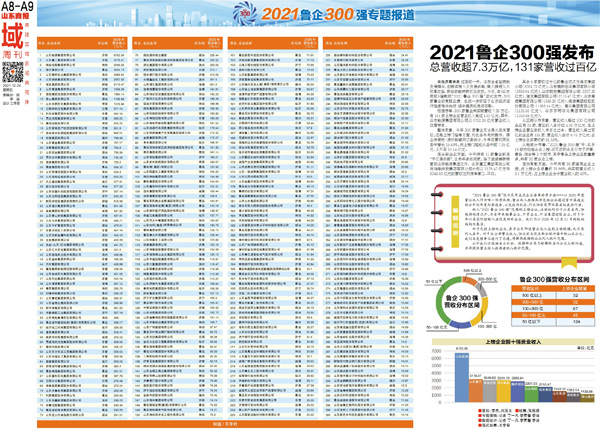 商报济南消息 过去的一年,山东全省坚持新发展理念,创新实施八大发展战略,强力推进九大改革攻坚,新旧动能转换初见成效。今日,由《山东商报》编制的“2021鲁企300强”正式发布,300家鲁企的亮眼业绩,也进一步印证了山东经济运行延续稳中向好、进中提质的良好态势。
