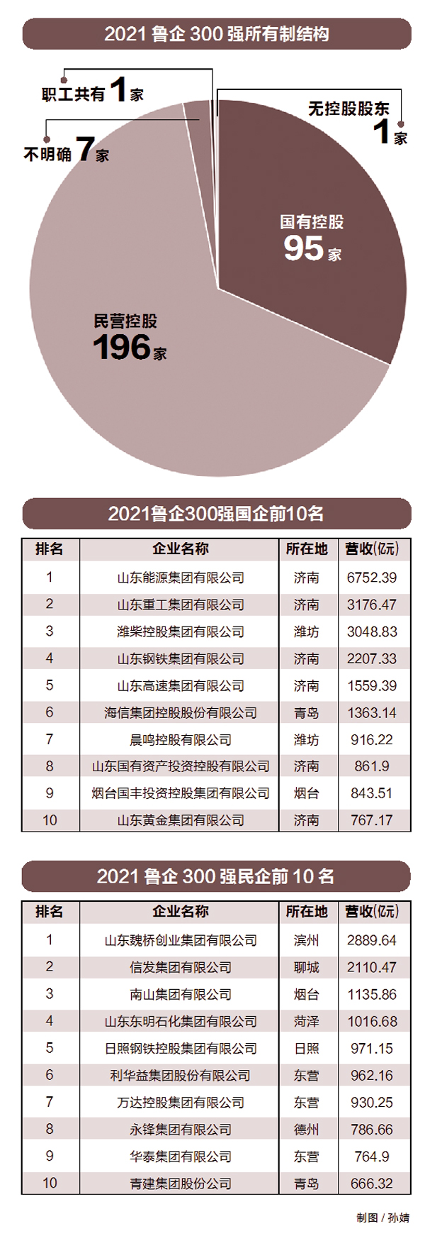“2021鲁企300强”中,上榜的196家民企共实现营收3.93万亿,魏桥集团居于首位;95家国企实现营收3.1万亿,其中,山东能源集团居首位。从区域分布来看,半岛经济重镇青岛上榜民企数量领跑,省会济南则继续保持了国企上榜数量的领先地位。