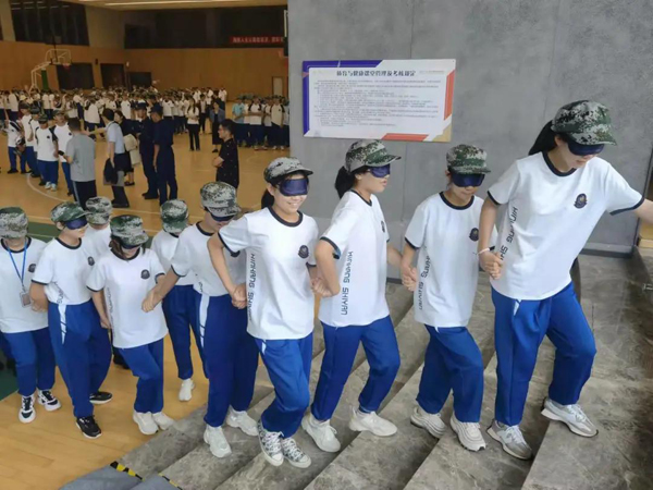 在新航实验,心理健康不是单纯的建档列表,而是与德育工作结合,通过开展丰富多彩的活动,缓解学生因学段转换、寄宿等方面的情绪焦虑。“团建破冰”是开学后的第一课,是学生在新学期入校第二天就享受到的学校“福利”——新生心理团体拓展活动,来了一场说走就走的“丛林旅行”。学校心理发展辅导中心宋艺奇老师向记者介绍,在“丛林旅行”环节,全体新生以班级为单位,在老师的带领下,所有同学蒙住双眼,从学校体育馆出发,沿不同的路线返回教室,并在途中完成一次队伍排头和排尾的翻转。日常看似简单的路程,在戴上眼罩后变得异常艰难,大家手拉手摸索前行,相互扶持、彼此鼓励,穿过校园、爬过陡坡、越过台阶、迈过坎坷,在集体的力量下成功抵达目的地。