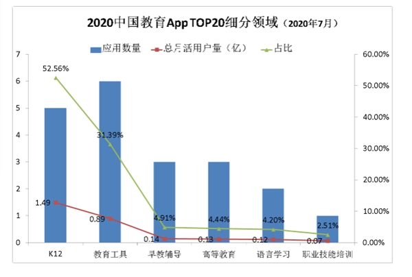 以2020中国教育App月活用户量TOP20为例,在图表中,我们可以看到,20种教育App里,K12类的教育App有5个,但这五个K12应用的总月活用户数量就已高达1.49亿,占比超过了TOP20月活用户数的一半(52.26%)。