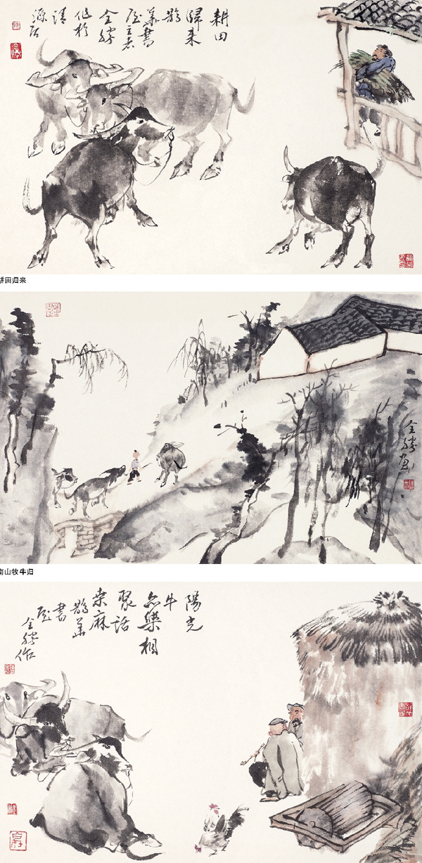 “经过黄胄先生的指导后,我对动物题材的研究更加用心了,特别是马、驴、牛、鸡几个题材,因为早年的一些工笔以及连环画作品中,马的题材用的比较多,在表现上也借鉴了很多古代的东西。”陈全胜说,在众多的动物题材中,最喜欢画的是水牛,因为它不仅入画,还具有优秀的品格。记得早年去南方出差,常见到这样一幅幅画面,有牧童吹着短笛,骑于牛背之上,徜徉于乡野小径。或是风雨中,身披蓑衣的小牧童,吃力地拽着犟牛,一个使劲拽,一个硬是不挪步。虽都是不起眼的生活场景,却因为自然而生动有趣。牛年到来之际,画一组水牛题材的作品,希望大家看后是轻松愉悦的,也希望借此重温牛的精神内涵。