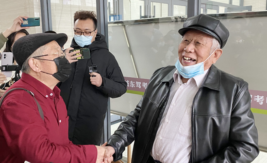 两位素不相识的老人很快热络地交谈起来,赵家生告诉李宗林,“别怕苦,好好练,年轻人背一遍咱背十遍;年轻人练十遍咱练二十遍。一定要对自己有信心。”受到鼓励的李宗林则自信地表示,“老大哥,等着我,我考出驾照后,咱们就组织个老年人自驾团,大家都带上老伴儿,一起去饱览祖国大好河山!”