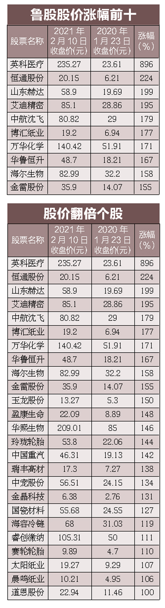 从2020年1月23日至2021年2月10日,从延期开市后大幅震荡到年内新高,鼠年A股称得上是跌宕起伏,激动人心,鲁股在过去一年中的变化同样值得一探。同花顺数据显示,除18只年内上市的新股外,210只鲁股中有90只股价上涨,其中25只股价翻倍,英科医疗更是凭借8.96倍的股价涨幅,成为当之无愧的“A股涨幅王”。不过,与全年A股整体“两极分化”的表现相一致,鲁股也出现了不少下跌的股票,其中有10只股票股价跌幅超过50%。◎山东商报·速豹新闻网记者 李迪