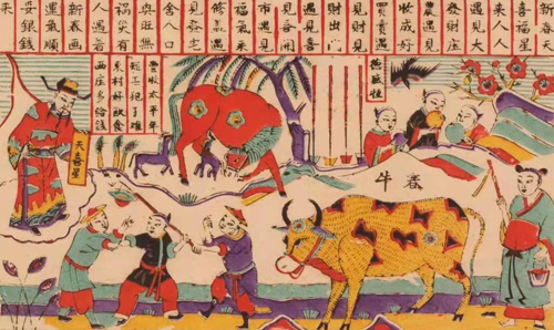 在农耕时代,牛在古代是重要的生产工具,也是生产力的代表。因其坚韧不拔的品质,牛往往承载着人们对美好生活的期盼。在民间也流传有相关的民俗与俗语。