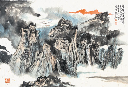“天地有大美而不言”。如果绘画作品能够做到展现天地之大美,做到“意与境浑”、情与景汇,意与象通”,达到艺术家情感、思想与绘画作品的完美融合,并且能够让观者被这种融合所触动、感动,那么就完美地阐释了中国画的意境之美。范正红先生近作《白云漫漫群峦幻》左方云烟弥漫,深远莫测;右侧峭壁矗立,山峦林壑,绵延无际,气势沉雄。何为意境,其实就是不尽的意味。如果画家没有宽广的心胸,包容的特质,深厚的文化积淀,娴熟精到的技法,厚积薄发的修养,对天地至美的感悟,绝难达此艺术美与自然美高度融合的境界,亦无法给人带来心灵上的冲击。正所谓,初学者学技法,熟练者融合技法、形式与内容,大成者让人忘却技法和内容,只给观赏者带来心灵的震撼和对美的由衷赞叹。