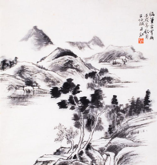 如果细观其画,能够感觉到范先生对传统笔墨的深入研究。1981年范正红先生17岁时作品《临夏圭山水》作大斧劈皴,就已经是老苍雄放、淋漓滋润、笔墨苍古、墨气袭人,“点染烟岚恍若欲雨,树石深淡遐迩分明”,尽得夏圭之神韵。1982年的《临董玄宰画》笔致清秀中和、恬静疏旷,用墨明洁隽朗、温敦淡荡,青绿设色,古朴典雅。又如1989年的《且为群山轻写神》,则尽显了石涛用笔的纵横恣肆,墨法淋漓,格法多变。