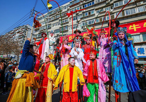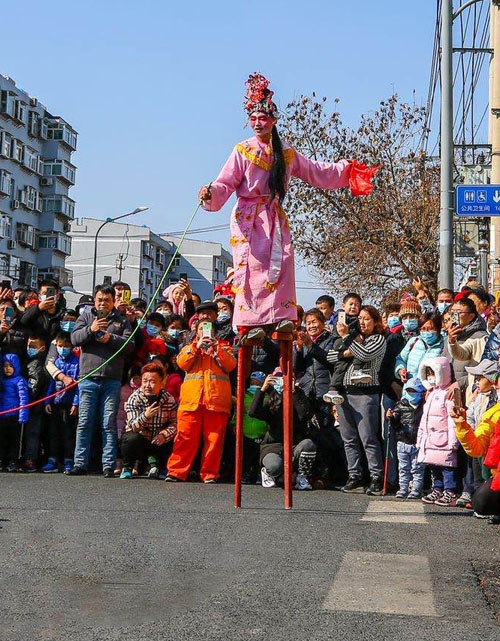 “高跷列队行进,到一些提前约好的商场、单位,还会停下来表演一阵。”刘海峰介绍,“一般最开始打头的是两个武生。这俩角色领头,踩得最高,一般是由健壮、练过武术的人扮演。接着是女装角色青蛇和白蛇,后面还跟着穿着肚兜的丑角傻小子和带着渔网的渔翁。之后就是在平地上走的艄公旱船和骑毛驴的。”演出的时候,武生会踩在高跷上舞刀、劈叉、翻跟头。武生一演完,大家的热情就起来了;之后是丑角与旦角上场,浩浩荡荡的队伍按着鼓点行走,走几步又蹦跶几步,伴随着淳朴敦厚的高跷鼓点,散发出一种古老而特有的乡土文化气息。大年节庆里,古老传奇的人物形象成为闹市区里独特的风景线。