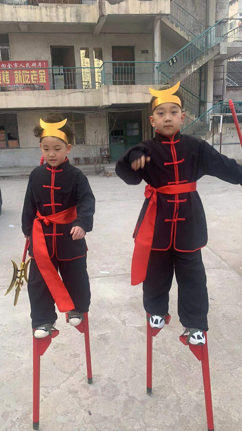 老有老的矫健,少亦有少的活力。一群表演者中,几个孩子的身影显得格外活泼灵动。今年14岁的吕冠宇是历城区董家中学的一名初中生,也是刘海峰的徒弟之一。别看他年龄虽小,资历却不浅。从6岁开始,他每年都会跟着爷爷看高跷表演,一来二去,孩子也爱上了这项传统民间艺术,干脆拜刘海峰为师开始了专业学习。吕冠宇性格活泼,说话时脸上涂的红色颜料也跟着一皱一皱的,“我喜欢踩高跷,也喜欢高跷队里的叔叔阿姨们。虽然他们很严格地教我基本功,给我纠错误,但我知道都是为我好。”