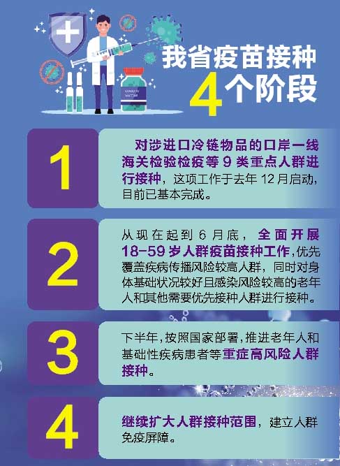 省卫生健康委党组副书记、省疾病预防控制中心党委书记马立新表示,根据疫情防控的轻重缓急和疫苗生产供应能力等情况,我省疫苗接种具体分为4个阶段。