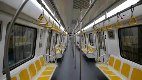 此外, 2号线“河脉黄”车辆内饰的设计也注重舒适感。2号线的客室座椅采用黄白两色搭配,清新明快,客室座椅宽度和侧窗面积与1号线、3号线相同,较传统地铁列车更加宽敞,提高乘坐舒适度。且配有根据运行环境自动调节亮度的LED灯带、以备乘客充电之需的USB快充接口、变频冷暖空调、免费无线网络等。此外,车内残疾人区还设有多功能半靠座椅,既能有效保证残疾人乘客的安全使用,也可以满足普通乘客的使用需求。