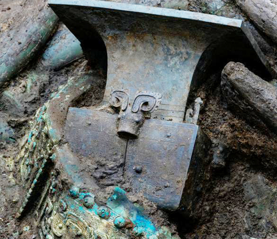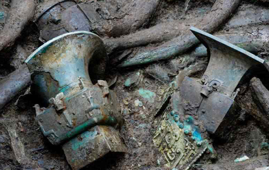 这是在三星堆遗址考古发掘现场3号“祭祀坑”内拍摄的青铜器和象牙
