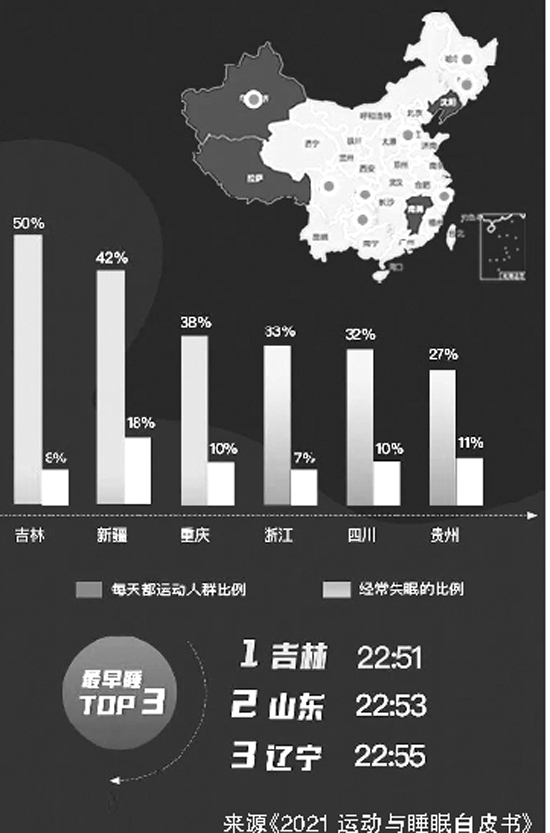 吉林老铁天天练,睡得早还少失眠!50%的吉林人每天保持运动,排全国第一,相应的,只有8%的吉林人经常失眠。有趣的是,吉林人不仅爱运动,少失眠,入睡时间也最早。山东的早睡时间排名第二,22:53进入睡眠。