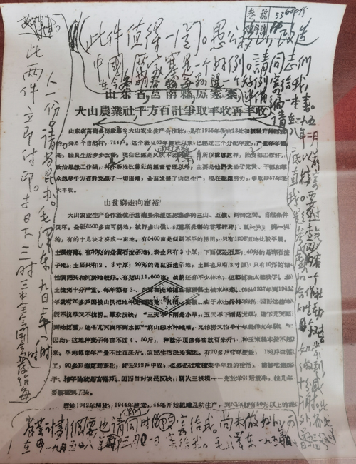 同年10月9日,毛泽东同志看了这个报告后欣然写下了如下批示:“此件值得一阅。愚公移山,改造中国,厉家寨是一个好例。请同志们在今冬明春每县选一个好例寄给我,准备编一本书。请在一九五八年二月底以前直接寄我……”