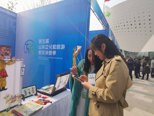 第五届山东文旅惠民消费季启动仪式现场非遗传承人向市民展示消费券领取方式