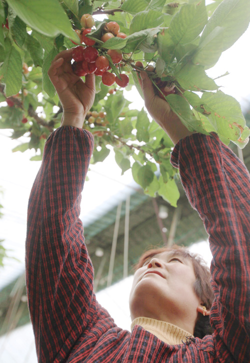外面的樱桃花竞相绽放,而耿启涛家大棚里的樱桃早已挂上枝头