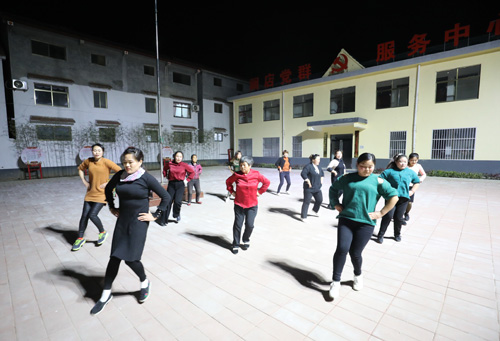 晚上,村子里亮了起来。村民们来到广场上跳舞健身。