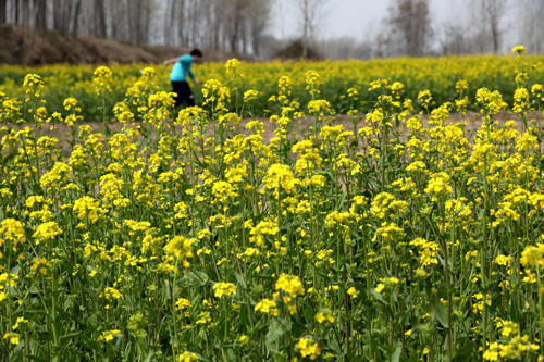 阚店村的南边有一条河,名叫万福河,河岸边种植着大片大片的油菜花田。