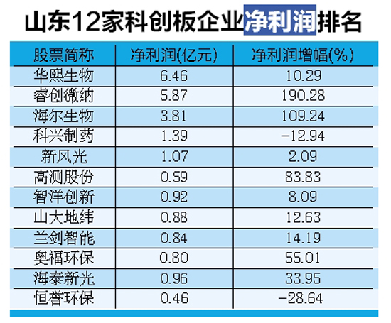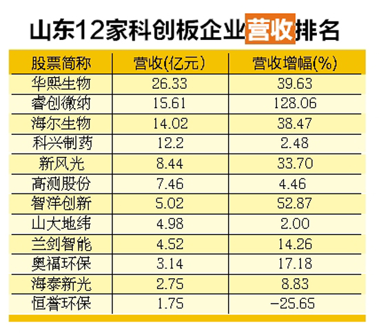 业绩方面,截至2021年4月26日,山东10家科创板公司披露2020年年报,剩余两家睿创微纳和山大地纬披露了2020年业绩快报。记者统计发现,在省内12家科创板公司中,有10家去年实现营收净利双增长,科兴制药净利润出现小幅下滑,恒誉环保出现业绩双降。