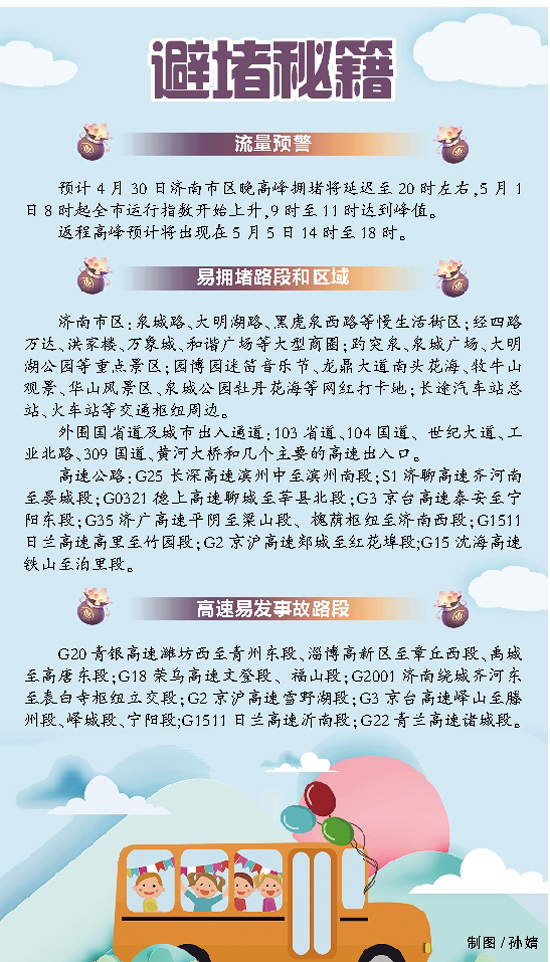 假期期间济南市运行指数较工作日有所下降,绕城内交通流量预计为日均101.7万辆左右,上午峰值出现在8时至10时,下午出现在16时至18时,其中5月5日14时至18时将出现返程高峰。