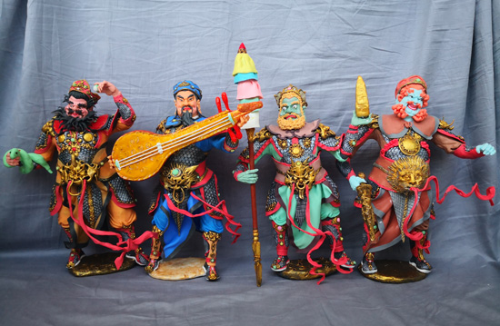 细看郑军的《风调雨顺四大天王》面塑作品,堪称恢弘壮观,形象逼真,十分具有震慑力。据她介绍,此作品她准备了约一个月左右,谈及制造作品缘由,她告诉记者:“我觉得它寓意很好,去年是我们国家极不平凡的一年,所以我做了‘四大护法’,希望他们能保佑我们的祖国。”