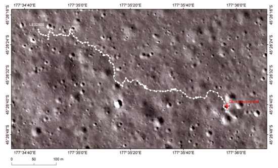 目前,巡视器正位于LE02805点,该点位于嫦娥四号着陆点西北方向,距离着陆点直线距离约455米,巡视器行驶路径里程约682.8米。基于LE02805点全景相机拼接影像、DOM影像等数据情况,月球车在第29月昼期间将继续向玄武岩分布区域(距离目前巡视器约1.2km,位于东经177.5389°,南纬45.4119°附近)前进,该位置位于当前探测点西北方向。相关科学成果将及时发布。