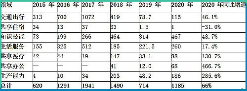 图为2016-2020 年共享经济各领域直接融资规模 数据来源:国家信息中心分享经济研究中心