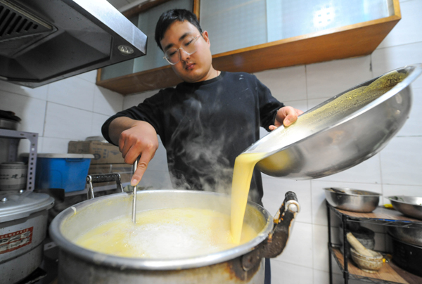小店的主人是90后小伙王传旭,从他爷爷传下来的甜沫手艺再经过厨师父亲的一次次改良,甜沫的口味很快被街坊邻居认可。