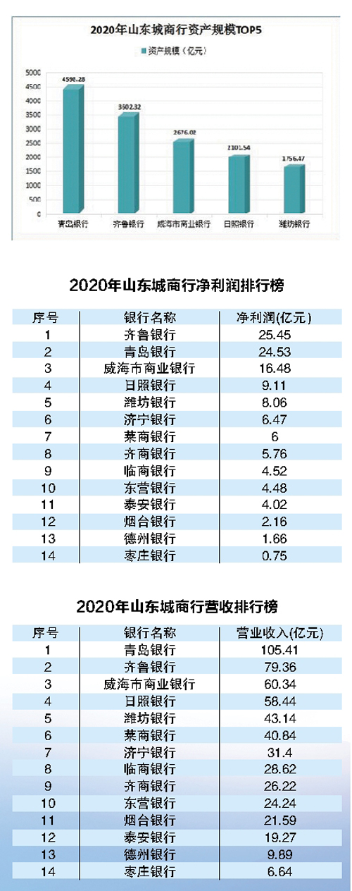 山东商报·速豹新闻网记者统计发现,截至2020年12月31日,省内14家城商行总资产规模达2.43万亿元,同比增长19.7%,去年实现营收555.4亿元,同比增长9.3%。尤其值得注意的是,尽管有减费让利实体经济等因素的影响,14家城商行的净利润仍旧同比微增,净赚119.45亿元。