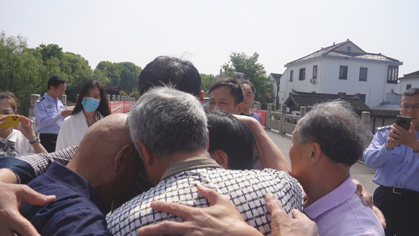 5月24日,在张家港塘桥镇金村,刚刚从东营赶来的吴寻,与他的哥哥姐姐们抱在一起。兄妹五人泪流满面,这一刻,他们等了52年。