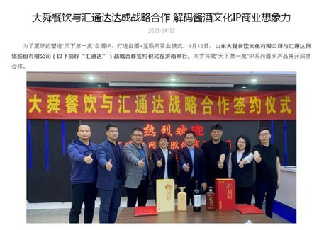 这则消息显示,为了更好地塑造“天下第一泉”白酒IP,打造白酒+互联网商业模式,山东大舜餐饮文化有限公司(简称“大舜餐饮”)4月13日与汇通达网络股份有限公司战略合作签约仪式在济南举行,双方将就“天下第一泉”IP系列酒水产品展开深度合作。